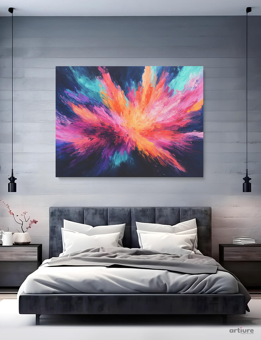 Cosmic Radiance presents a high-impact composition where streaks of vivid color fan out in a mesmerizing burst. Painted in a contemporary, abstract style, it blends fiery oranges and pinks with cooler blues, creating a visually arresting piece—ideal for modern living rooms, offices, or creative studios seeking a bold, expressive focal point.