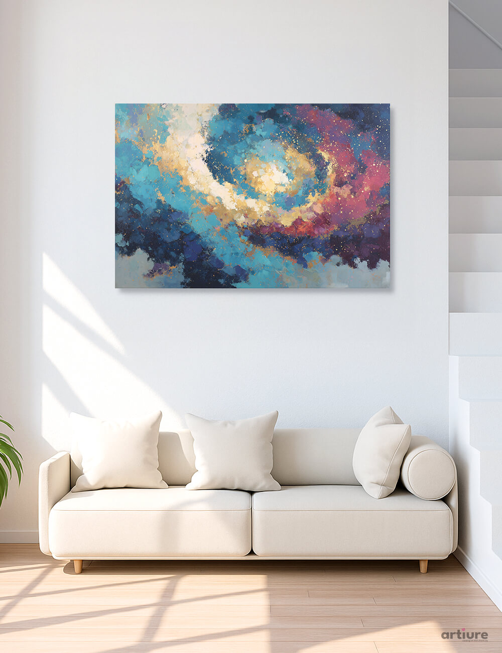 This is a vivid abstract canvas print that captures a spiral of color and light. The composition blends blues, teals and golds with touches of white and purple to suggest a galactic swirl. The textured strokes create depth and movement, making it a dynamic focal point in modern living spaces. Printed on high-quality canvas, the piece arrives ready to hang and pairs beautifully with neutral furnishings while adding a kinetic splash of color to the room.