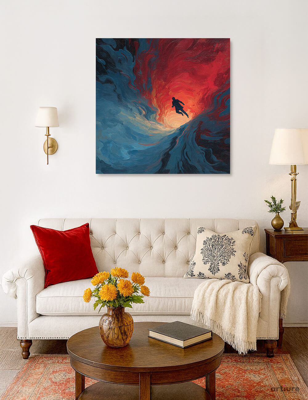 An arresting canvas print that blends a feverish vortex of crimson, tangerine and deep blues into a tidal swirl, suggesting motion beyond the frame. A solitary silhouette glides toward the light at the heart of the composition, anchored by bold brushstrokes and luminous gradients. The piece marries dreamlike surrealism with abstract gesture, inviting viewers to wander through the swirl and contemplate transformation, momentum, and escape. The glossy, high-contrast surface enhances the color drama, making it a statement focal point in contemporary interiors. Ideal for modern living rooms or creative spaces seeking kinetic energy, this artwork pairs best with neutral furniture and warm metallic accents to amplify the warmth of the center glow.