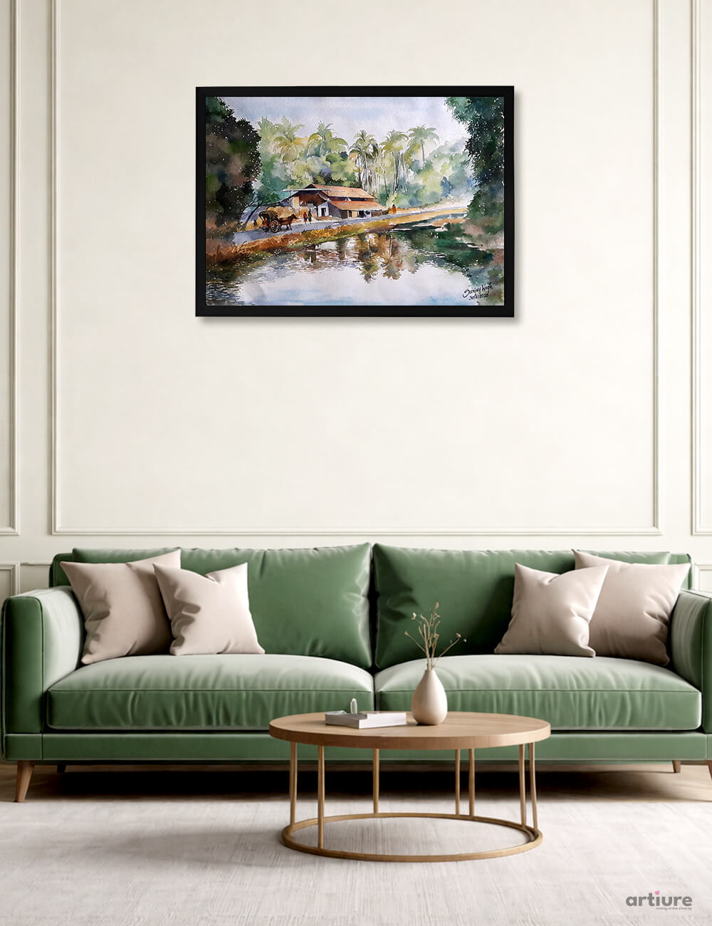Countryside Calm beautifully captures the essence of rural tranquility through soft watercolor strokes and harmonious natural tones. The artwork showcases a quiet village setting with traditional homes, tall palm trees, and a reflective water body that mirrors the peaceful surroundings. The subtle interplay of light and shadow enhances the depth and realism, while the earthy palette evokes warmth and nostalgia. This painting invites viewers to pause and immerse themselves in a slower, more mindful way of life. Perfect for creating a soothing ambiance, it brings nature’s calm and rustic charm into any interior space with elegance.
