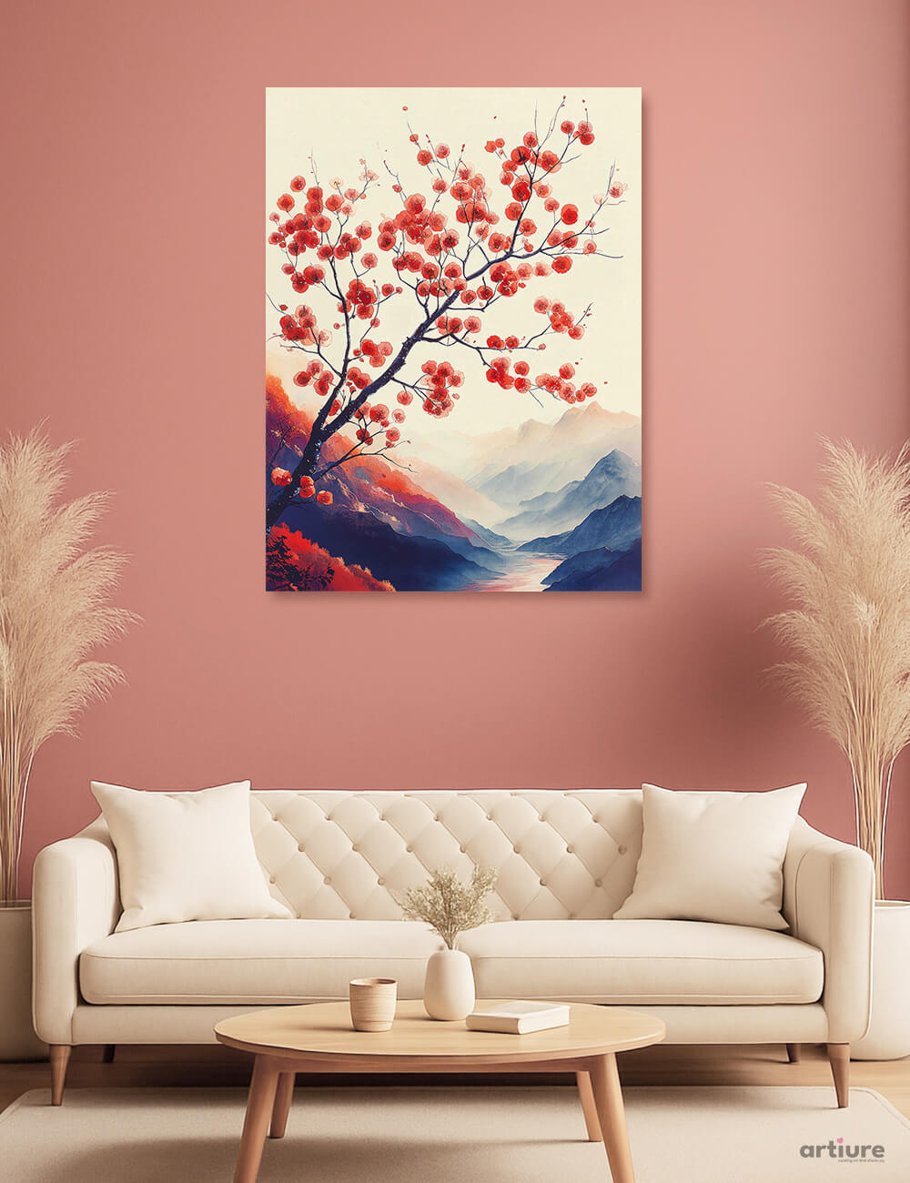 A vivid canvas print of a blooming tree with scarlet blossoms rising over layered mountain ranges, painted in a luminous palette that shifts from warm pinks to cool blues. The composition guides the eye along sweeping branches toward a tranquil valley, blending botanical sweetness with contemporary decorative flair. Subtle gradients and soft edges give the scene an almost dreamlike quality, making it versatile for modern living spaces. Hang this piece in a living room or bedroom to energize walls with a cheerful yet serene focal point, or use it in creative workspaces to spark moods of optimism and calm.