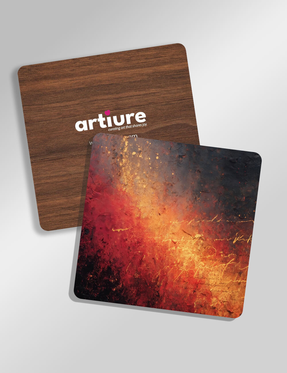 Uploaded as a companion pair of coasters, this piece fuses a bold abstract fire gradient with a wood-textured back, delivering warmth and tactile contrast to any table. The front surface bursts with crimson and orange flames, flecked with gold specks and soft parchment-like script echoes, while the reverse adopts a rich wood grain that anchors the design in everyday dining. This AI-generated motif captures a sense of momentum and craft, pairing protective practicality with striking artistry. Ideal for modern kitchens, dining rooms, or gift-worthy setups, it elevates casual moments into contemplative experiences. The print is finished to resist spills and fading, making it suitable for everyday use or display on coffee tables and bar carts. A vivid accent that invites conversation without overpowering the meal.