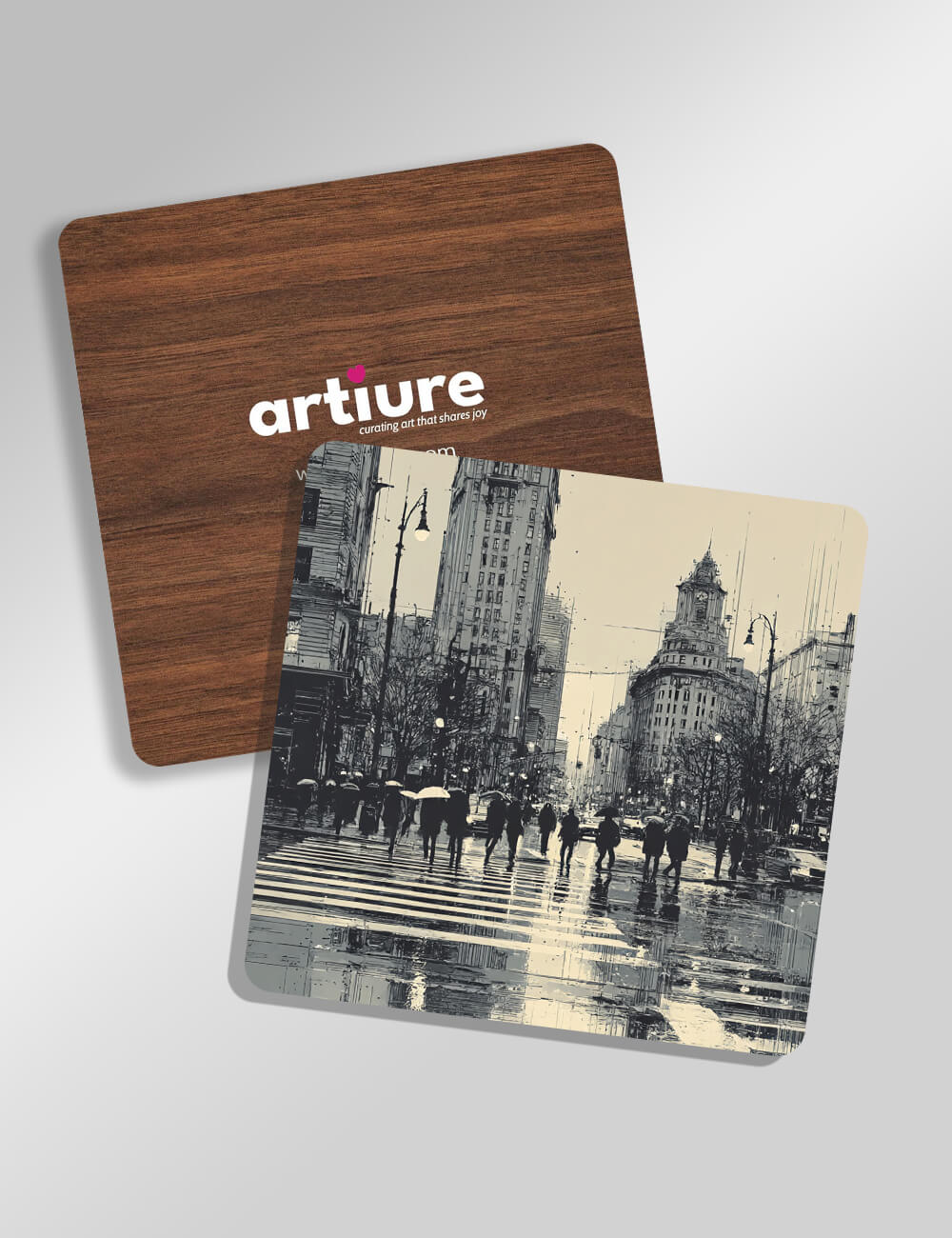 "Crosswalk in Monochrome" Wooden Coaster Set (4x4 inch) crafted from 2.7mm Pine Wood (UV Printed Front, Black Back) and encased in a 4mm MDF Coaster Case (UV Printed Top), the set of 6 coasters captures a rainy day in the city with stark elegance. Umbrellas dot the crosswalk as silhouettes move through reflections on slick pavement. Tall heritage buildings and bare trees stretch into a pale sky, offering a quiet yet cinematic view of city life. Ideal for modern workspaces, minimal interiors, and monochrome lovers.