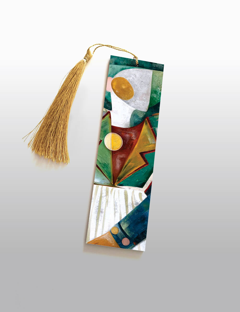 "Cubist Pause" Wooden Bookmark (2 x 6 inch) is crafted from 2.7 MM Pine Wood and UV Printed on both sides. With a striking cubist design composed of layered shapes and contrasting textures, this bookmark adds an artistic edge to your reading rituals. Finished with a golden tassel and a clean matte wood finish, it blends the rawness of modern art with the warmth of handcrafted form.