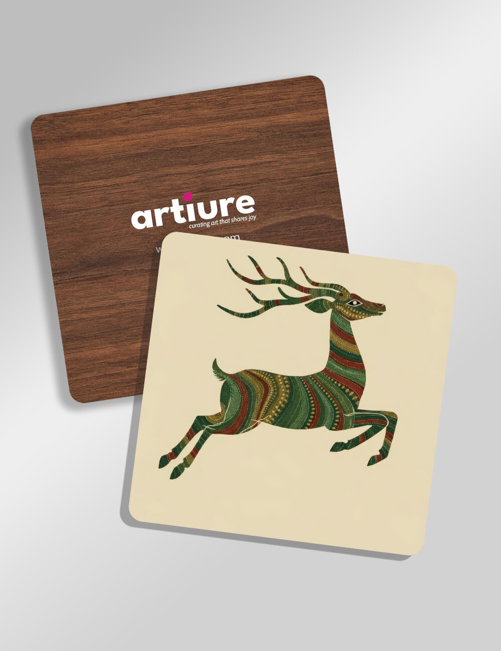 Presented on a cream backdrop, this coaster features a stylized deer rendered in layered greens, reds, and golds with intricate patterning. The print sits atop a pale surface that contrasts with a rich wood-backed base, ensuring a durable, moisture‑resistant accessory for the dining table or coffee nook. The design blends boho textures with abstract geometry, inviting nature-inspired calm into everyday rituals. Perfect for gifting or brightening kitchen counters, these coasters pair with earthy palettes and casual spaces, adding a touch of artisanal charm without overpowering table settings. Made for everyday use, they combine practical durability with decorative storytelling, turning simple sips into small moments of delight.