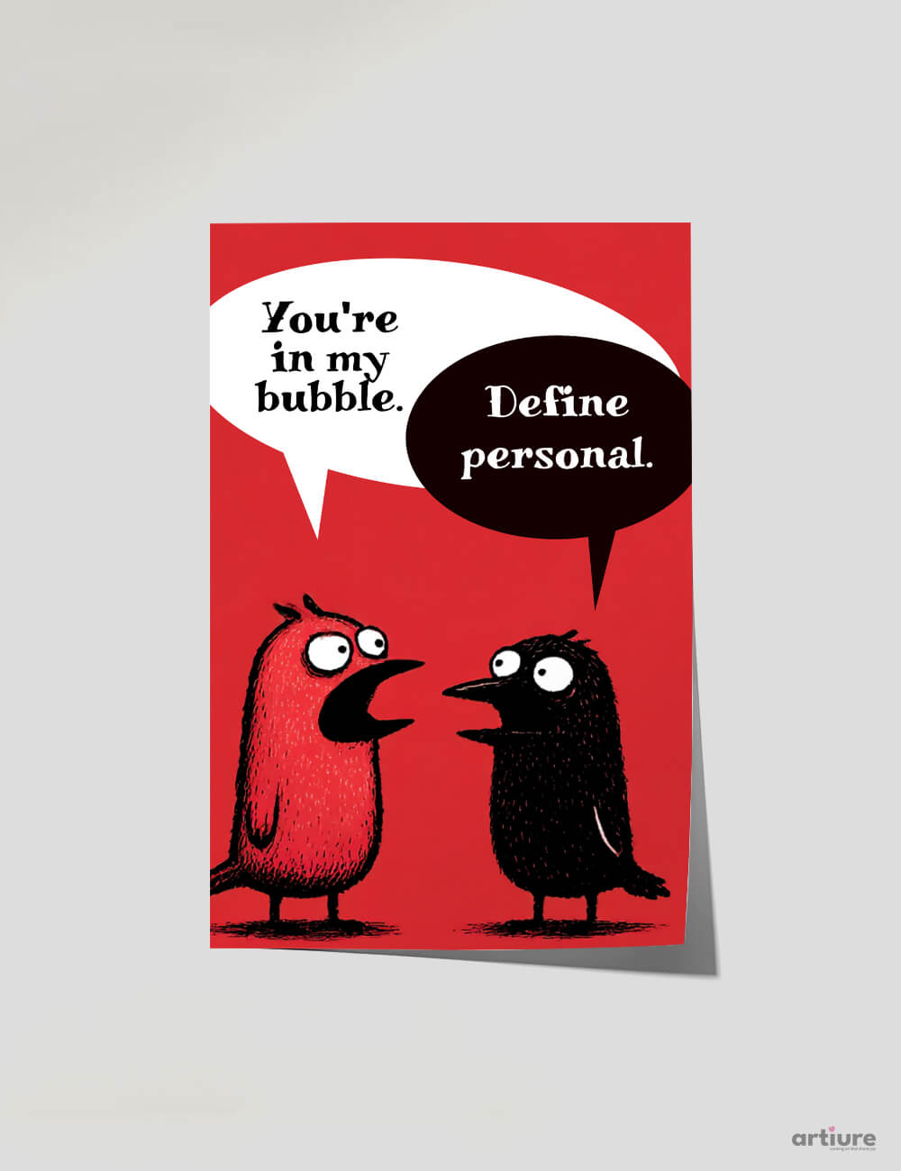 From the Birds of Banter series, this poster brings you a snappy standoff between a red bird protecting its space and a black bird redefining personal boundaries—with perfect comedic timing. Set against a bold red background, it’s a quirky and relatable wall accent for any room with a sense of humor.