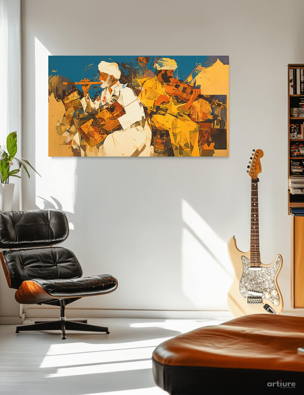 Desert Folk Melodies showcases two turbaned performers immersed in music against a warm desert backdrop. Painted in a blocky, collage-like style, the composition exudes the rhythmic charm and cultural richness of Rajasthan. Ideal for cultural centers, living rooms, or any space seeking an energetic, regionally inspired focal point.