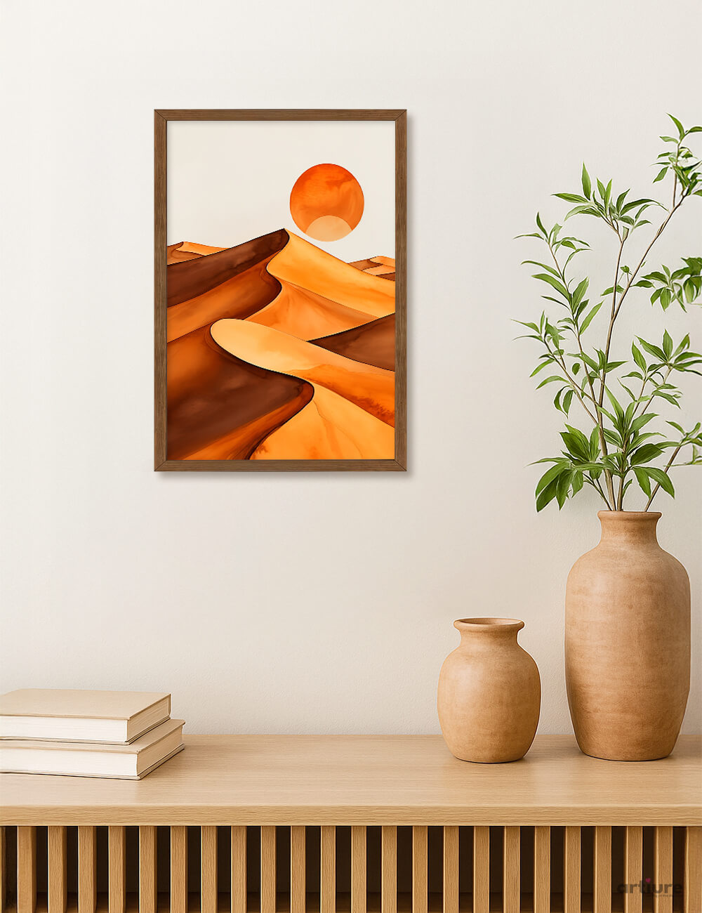 An evocative abstract desert scene captured in warm amber and ochre tones. The composition trades literal detail for fluid, dune-like forms that sweep across the canvas, guiding the eye toward a bold orange sun. The palette blends beige, brown, and creams with bursts of sunlit gold, creating a sense of heat, distance, and hush. This print emphasizes mood over realism, inviting contemplative moments in living rooms or bedrooms. Framed in a natural wood frame, it pairs easily with minimalist furnishings, earthy ceramics, and soft textures. Perfect for spaces seeking a calm, sun-warmed focal point that marries modern sensibility with organic warmth.