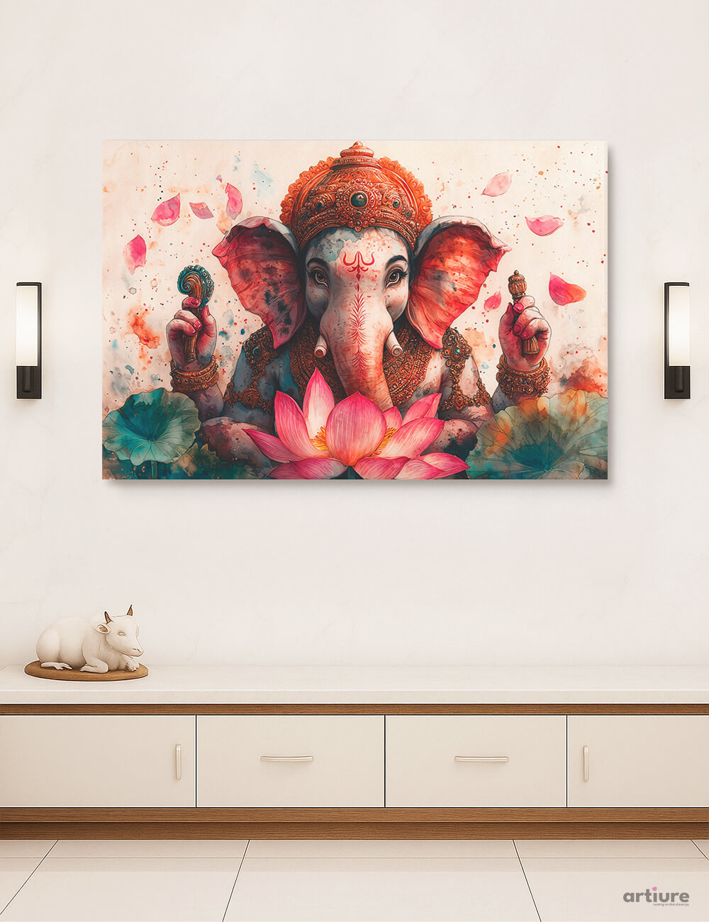 A luminous canvas print capturing the revered elephant deity Ganesha. Rich with ornate gold embellishments, pink lotus blossoms, and a teal-blue aura, the piece blends traditional iconography with contemporary illustration. The composition centers on the deity's serene expression and ceremonial regalia, surrounded by floating petals and lotus leaves, creating a balanced focal point ideal for living rooms or cultural spaces. The palette spans soft beiges to saturated pinks and blues, finished with subtle splashes of color that evoke festive energy while remaining sophisticated enough for modern interiors.