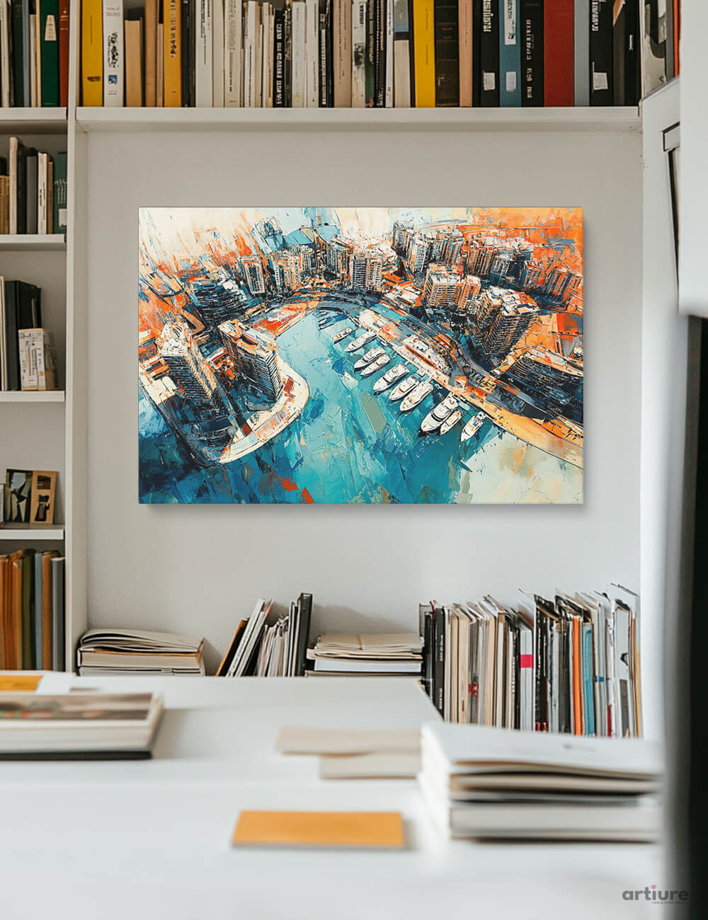 Dubai Marina Vista captures the ultra-modern spirit of Dubai Marina with its striking skyscrapers, luxury yachts, and shimmering waterfront. Rendered in a bold, collage-inspired style with vibrant blues and oranges, this artwork celebrates the energy and futuristic allure of Dubai’s iconic marina. Ideal for modern living rooms, offices, or any space seeking a sophisticated urban statement.