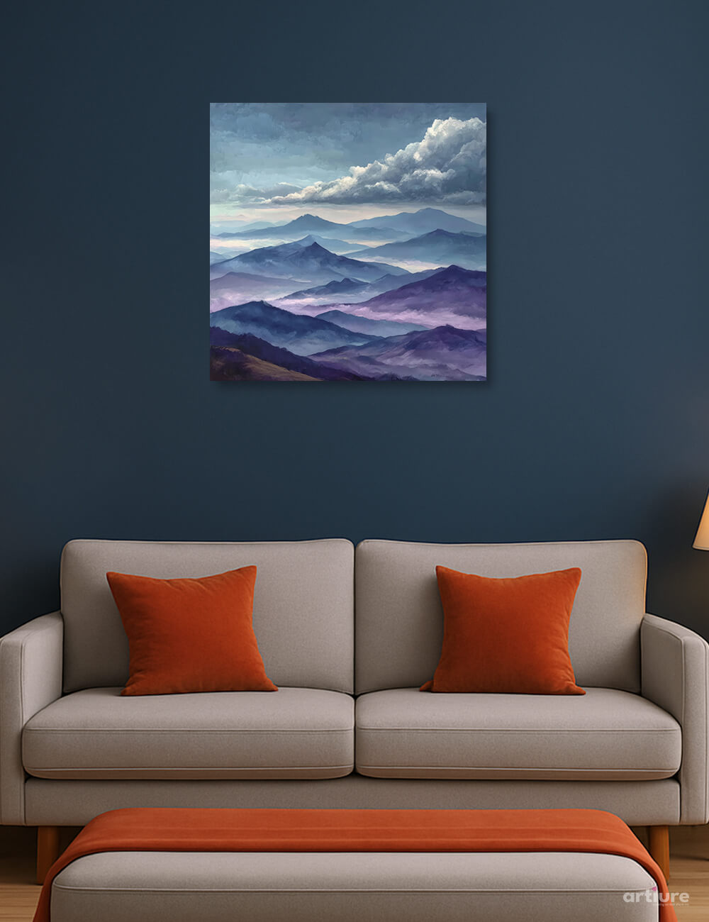 This artwork shows a quiet stretch of mountains, fading into violet haze under a heavy sky. The clouds move slow, like they’re holding something unsaid. The light feels distant. It’s a moment that asks for nothing—just to be seen.