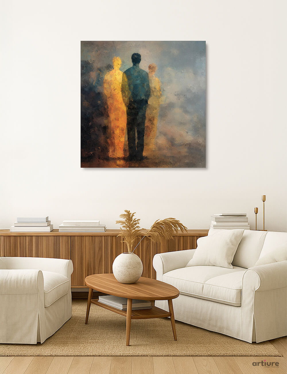 This AI-generated canvas prints piece presents three blurred figures emerging from a moody gradient—blue, amber and earthy browns—set against a misty backdrop. The textured, impressionistic brushwork builds depth through layered color fields, inviting viewers to interpret human presence within an elusive atmosphere. The cool blues contrast with warm ochres, creating a balanced tension that feels both intimate and expansive. Suitable for modern living rooms or creative workspaces, it adds atmospheric color and a sense of narrative without overpowering a room. The print on canvas offers a tactile, gallery-worthy finish that enhances light and shadow, making it a versatile focal point for minimalist or eclectic interiors.
