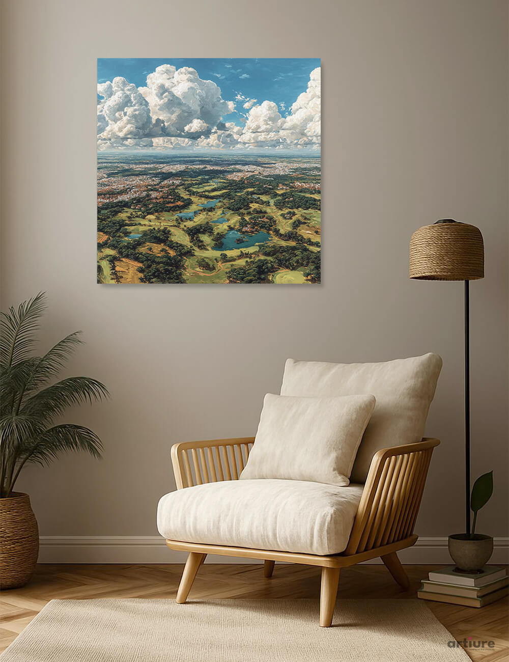 A panoramic canvas print capturing a vibrant contrast of emerald fairways and lakes beneath a sky crowded with billowing clouds. The composition lingers on a sweeping horizon where earth tones meet a cobalt blue expanse, inviting calm and contemplation. This AI-generated landscape brings a contemporary, photoreal sensibility to any living space, pairing well with warm woods and neutral textiles. Ideal for modern living rooms seeking a touch of nature and expansive mood.