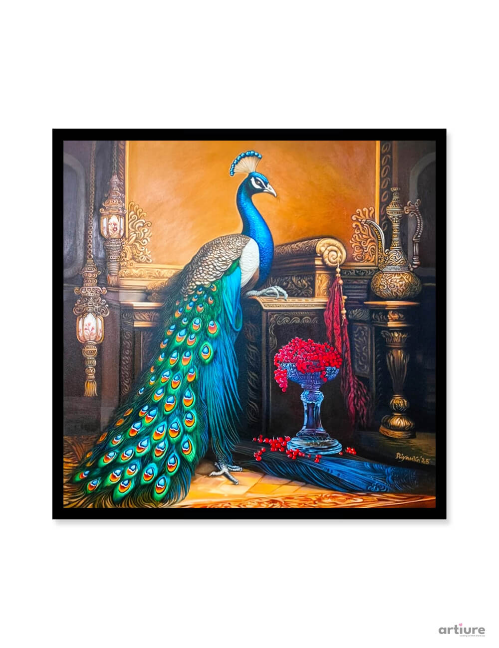 “Eternal Elegance” captures the mesmerizing beauty of a peacock in a richly adorned royal setting, reflecting grace, pride, and timeless sophistication. The vibrant blues and greens of the peacock’s feathers contrast beautifully with the warm golden background, creating a striking visual harmony. Intricate detailing in the surroundings enhances the regal atmosphere, while the delicate placement of flowers adds softness and balance. This acrylic on canvas artwork embodies both natural beauty and artistic refinement, making it a perfect statement piece. It evokes a sense of luxury, tradition, and serenity, ideal for elevating any modern or classic interior space.