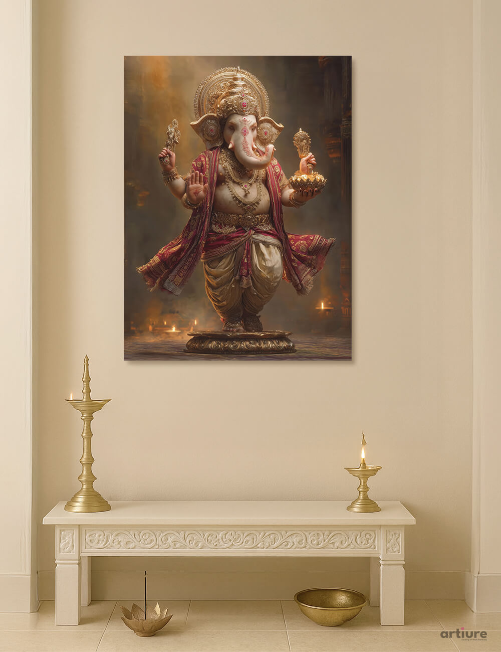 This grand artwork captures Lord Ganesha in an awe-inspiring form, richly draped in red and gold garments with intricate jewelry and ornaments. Holding a radiant golden lamp, He becomes the eternal source of light that dispels darkness and illuminates the path of wisdom. The warm glow of temple lamps enhances the divine aura, making this canvas a powerful emblem of prosperity, protection, and blessings. Perfect for prayer spaces, living rooms, or as a meaningful festive gift, this piece is an embodiment of abundance and spiritual grace.