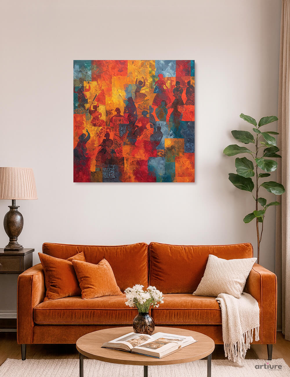 An abstract square canvas print unfolds as a vibrant mosaic of warm reds, oranges, yellows and contrasting blues and teals. Fragmented blocks merge into silhouettes of figures, giving movement and rhythm while preserving an overall non-representational charm. The composition feels playful yet refined, making it a bold focal point in contemporary living spaces. The color-blocked pattern and square format suit compact rooms, pairing beautifully with earthy furniture and natural textures like wood and linen. Printed on canvas for a rich, tactile finish, this piece brings warmth, energy and a modern art vibe to any wall it graces.