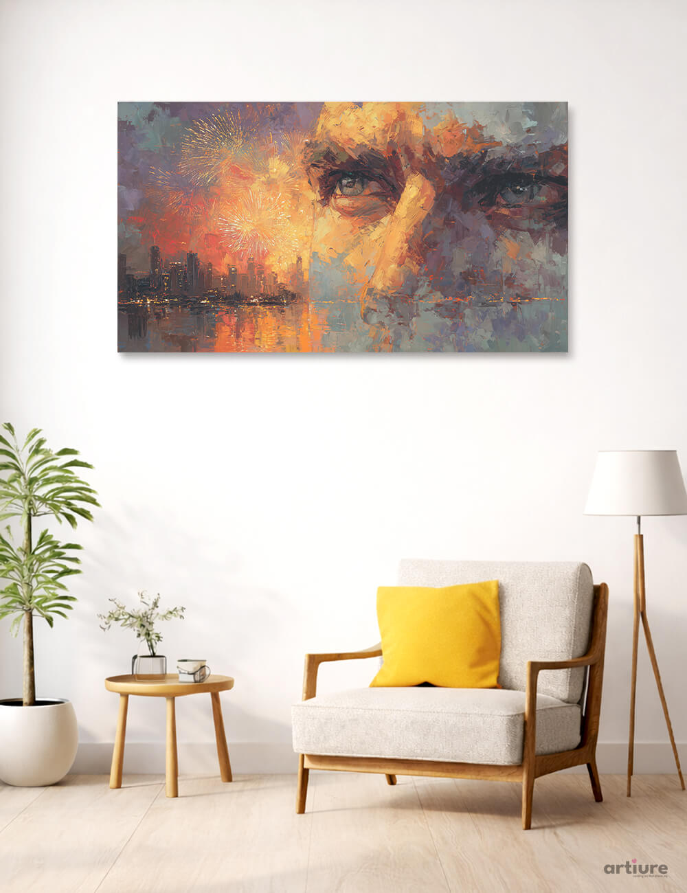 This canvas print blends a city skyline with a luminous, firework-infused portrait, rendered in bold, textured strokes. Warm ambers, oranges and yellows ignite the skyline while cooler blues and grays carve the face and reflections across the water. The composition balances abstract brushwork with recognizable urban silhouettes, creating a dynamic, cinematic mood. Printed on canvas, the piece offers depth and a painterly surface that catches light and rewards close inspection. The artwork communicates energy, celebration, and urban dreams in a vivid, contemporary language.