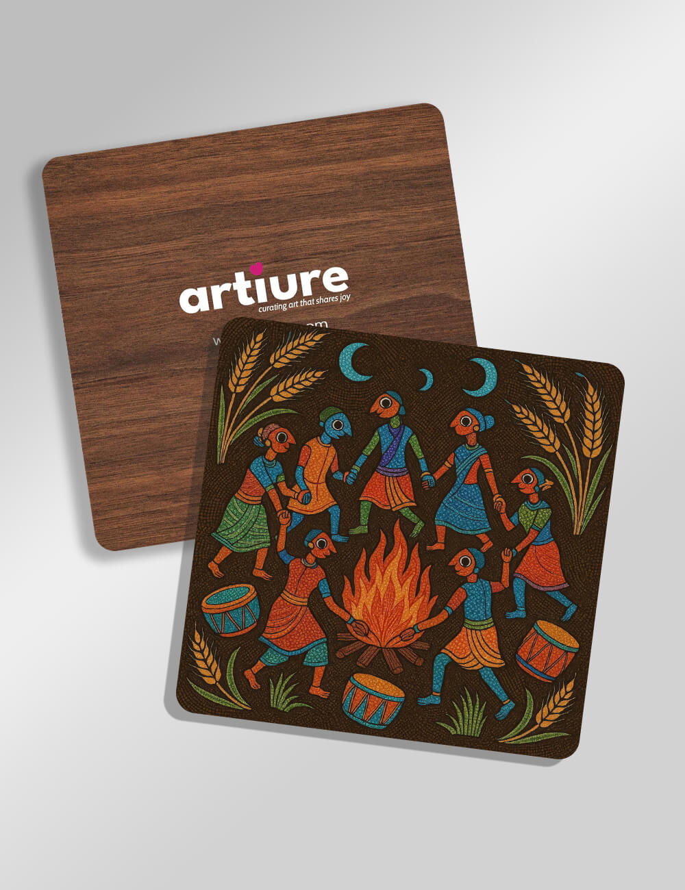 Vibrant folk-art inspired coaster design captures a communal dance around a crackling bonfire. Dancers in bright robes circle the flames against a deep brown backdrop, drums and wheat stalks framing the lively scene. The artwork blends traditional motifs with contemporary textures, creating a tactile, hand-crafted feel suited for kitchen counters, dining spaces, and entertaining nooks. This coaster pairs warm earthy tones with rich accents of teal, blue, and orange, making it a conversation-worthy accessory that protects surfaces while adding cultural charm. Printed on durable wood composite, the coaster stack promises longevity and easy cleanup, while the graphic preserves the intricate lines and festive rhythm of the scene. A tasteful nod to heritage-infused decor for everyday use.