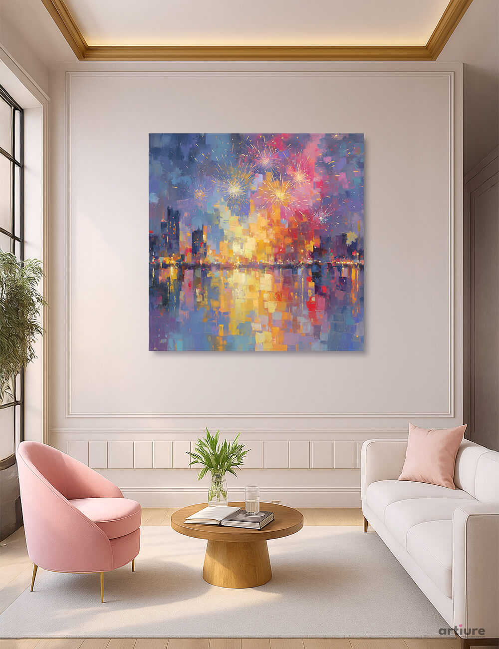 This square canvas captures a luminous city skyline as night erupts into color. MODULAR blocks of pigment form a radiant mosaic, where fireworks bloom above a shimmering waterfront and reflections shimmer across the water. The palette merges cobalt and ultramarine with sunlit yellows, magenta, and tangerine, while hints of lavender and gray unify the scene. The brushwork feels energetic yet controlled, balancing abstract geometry with a dreamlike city mood. A bold centerpiece for contemporary interiors, this canvas print brings kinetic glow and optimism to living rooms, offices, or creative spaces. AI-generated artistry offers a fresh take on urban celebration, pairing well with neutral furnishings and soft palettes to let the colors sing.