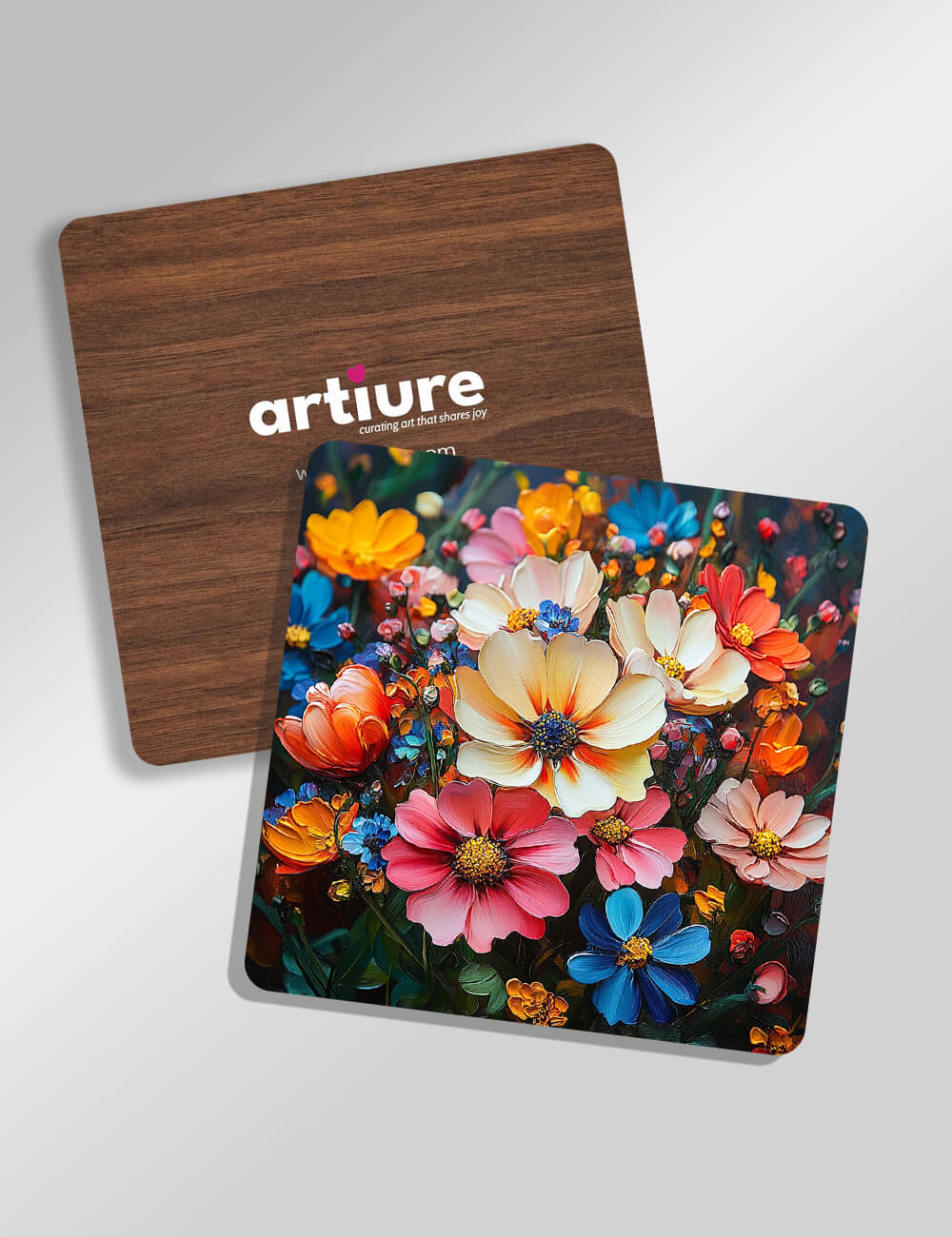 A vivid floral companion for the table, digitally crafted into a coaster design that merges bold petals with a rich wood-grain base. The artwork bursts with diverse blossoms in reds, pinks, yellows, blues and greens, capturing a painterly, almost tactile texture. Ideal for brightening kitchen and dining spaces, this piece pairs well with modern and eclectic decors, reminding hosts to celebrate everyday moments with color. Created through AI-generated processes, it emphasizes lush detail and vibrant contrast while remaining suitable for coasters and small surfaces. Colors and depths may differ slightly between on-screen and printed finishes.