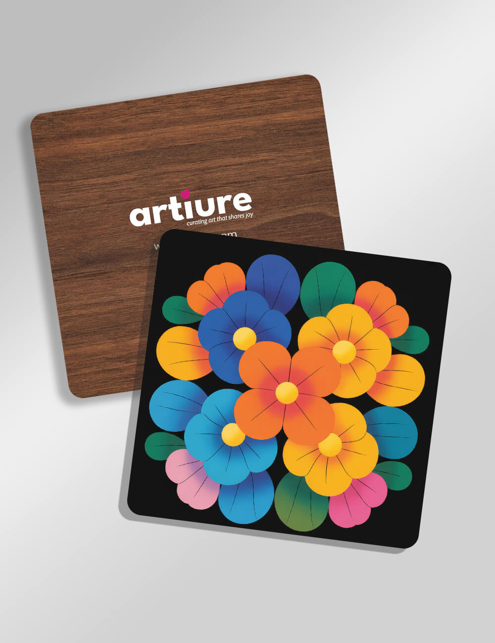 Vivid square coasters showcase bright, abstract floral motifs arranged in overlapping petals of blue, orange, yellow, pink and green against a sleek black field, with a natural wood backing peeking beneath. This AI-generated design blends contemporary graphic flair with tactile practicality, offering eye-catching protection for tables while elevating a dining setting with bold color and joyful whimsy. The durable print on a coaster surface ensures clean, easy maintenance, making it ideal for daily use or as a thoughtful gift. Perfect for modern kitchens, coffee nooks, and entertaining spaces, these coasters invite playful color storytelling at every meal and coffee break.