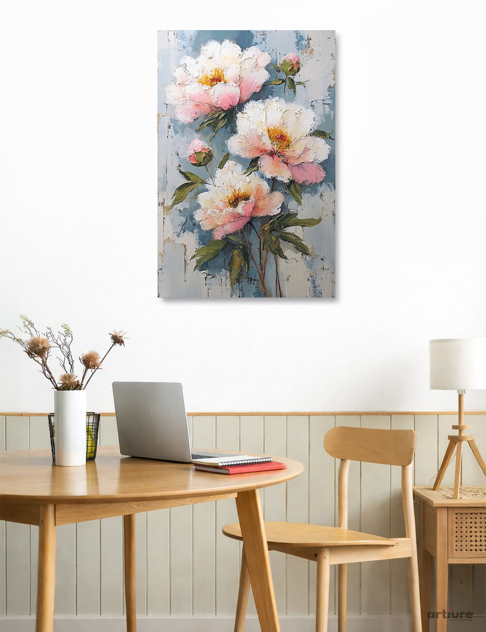An exuberant bouquet of pink and white peonies unfolds across a weathered blue-gray canvas, each bloom built with generous impasto that catches light and shadow. The painterly strokes create tactile vitality, as petals curl and fold with soft, luminous edges. A verdant network of leaves and stems anchors the composition, while a crackled background suggests aged plaster, adding depth and contrast. The piece radiates a fresh, contemplative mood, balancing delicate romanticism with a modern, almost sculptural presence. Ideal for brightening contemporary interiors, it pairs well with natural wood tones and minimalist furnishings, inviting the eye to linger on texture, color transitions, and the quiet drama of floral form.