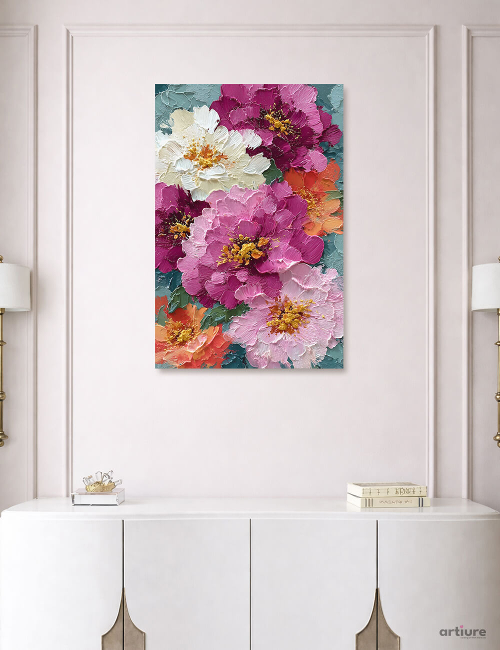 An exuberant floral study roams across thickly layered petals, each bloom carved with impasto texture and radiant color. The composition stacks pinks, magentas and purples with white, yellow and orange centers, set against a cooler teal backdrop that makes the flowers pop with buoyant energy. The brushwork suggests movement and light, balancing bold contrasts with delicate shading to evoke a sunlit bouquet captured in a single moment on canvas. This print preserves the tactile depth of the bouquet, inviting close inspection of the raised petals and the luminous tonal shifts. Ideal for modern living spaces, entryways, or dining nooks that crave a vivid focal point and a sense of joyful abundance.