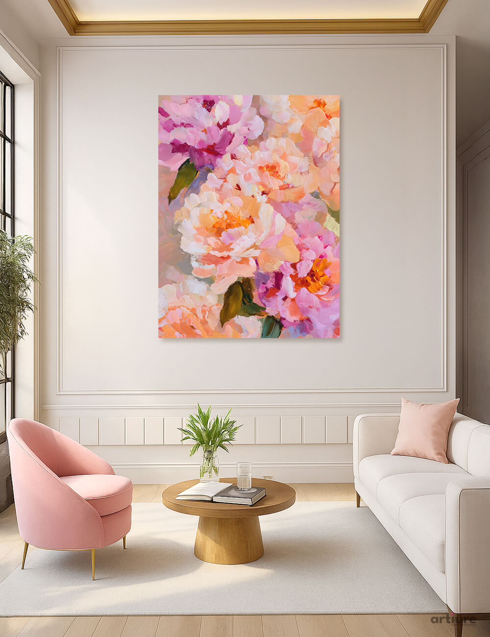 This canvas print captures an exuberant bouquet in painterly strokes of pinks, peaches, and creams, tempered by fresh greens and lilac undertones. The loose, impressionistic rendering invites light to dance across the surface, making the floral forms feel buoyant and contemporary rather than formal. Sized to command a focal wall, the piece pairs gracefully with neutral paneling and soft pink accents, as shown in a sunlit living room. The warm palette echoes the room’s blush upholstery while the bold brushwork adds movement and texture. A versatile centerpiece for modern interiors seeking a touch of romantic color and airy optimism.