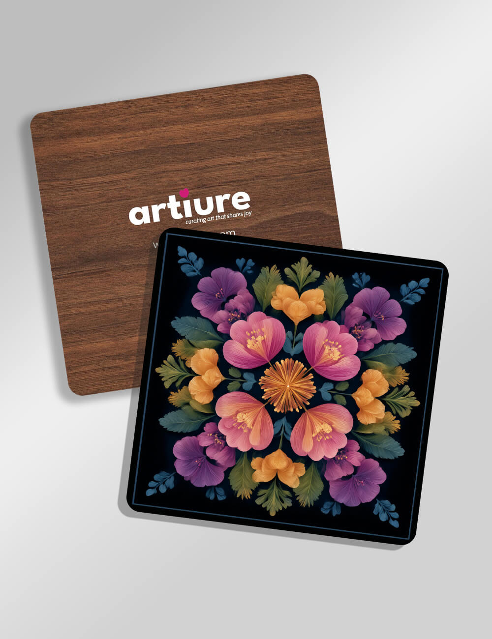 A square wooden coaster showcases a lush bouquet of tropical florals rendered in vivid pinks, purples, oranges and greens against a deep, almost midnight background. The artwork seems to float on the wood grain, blending botanical detail with clean, contemporary lines. Designed for kitchen counters and dining spaces, this coaster pairs practical serendipity with decorative flair, adding a burst of color to everyday moments. The rounded edges and premium finish reflect Artiure’s craft ethos, making it suitable for gifting or daily use. Printed on natural wood, the piece balances warmth with modern illustration, inviting admiration from art lovers and collectors while elevating cup and plate presentations with a botanical joie de vivre.