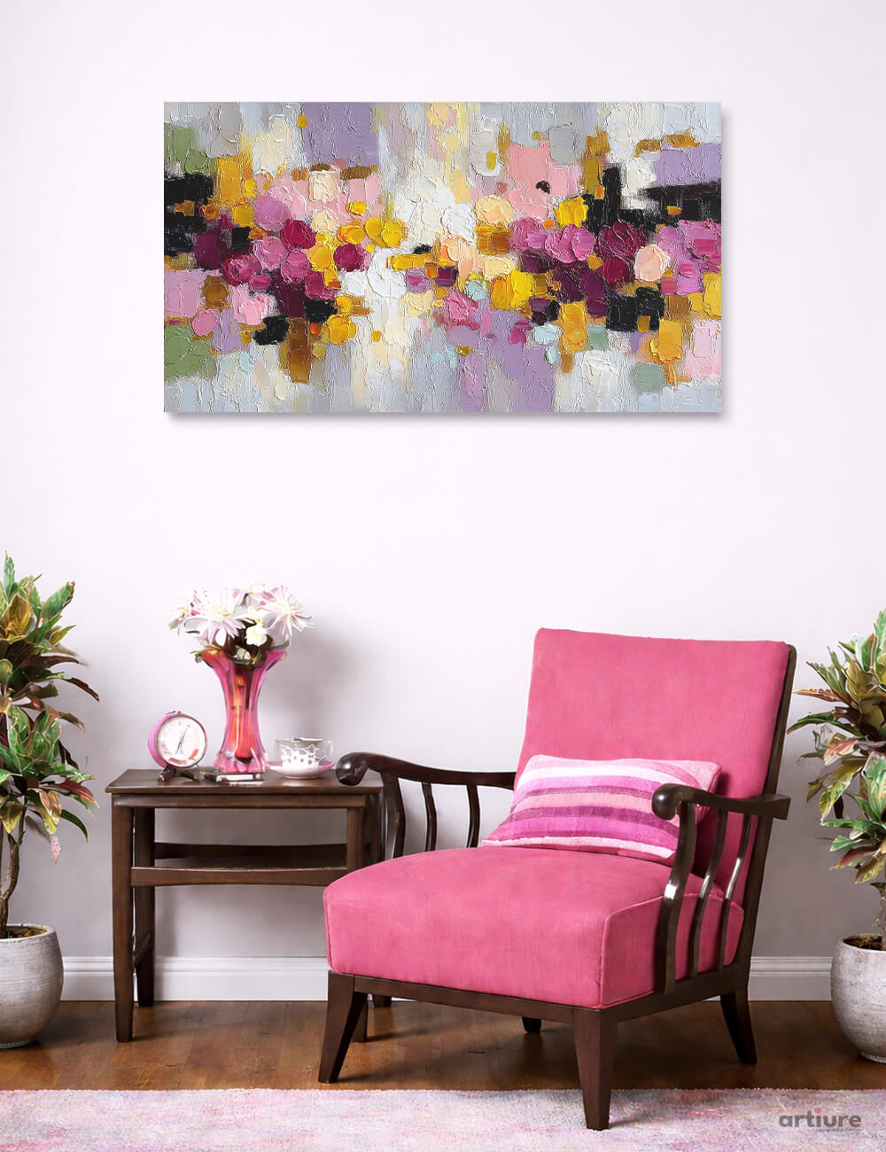 There's something intoxicating about watching order dissolve into pure feeling — and that's exactly what happens here. Bold strokes of magenta and gold dance with whispers of lavender and cream, each color claiming its moment before melting into the next. The paint feels alive, thick and textured, as if it's still wet with possibility. Black anchors the composition like punctuation marks in a love letter, while soft grays provide breathing room between the bursts of joy. This is the kind of piece that makes a room feel instantly more alive — hang it where you need a daily reminder that beautiful chaos is still beautiful.