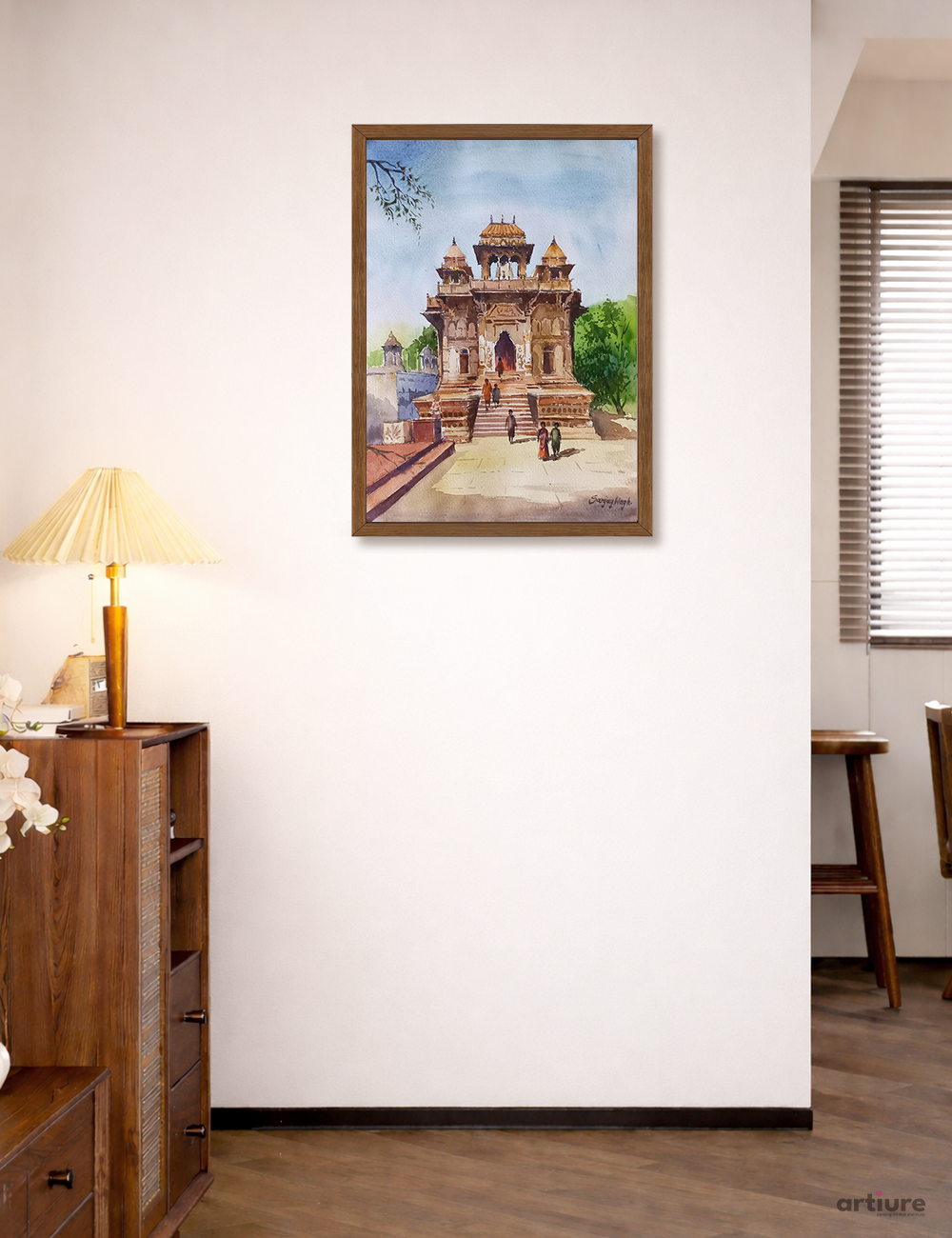 This watercolor artwork portrays a majestic heritage gateway standing proudly under a soft blue sky, inviting viewers into a timeless scene. The warm earthy tones highlight intricate architectural details, while gentle shadows add depth and realism. Small human figures climbing the steps bring life, scale, and narrative, reflecting daily rhythms and cultural continuity. Surrounding greenery and open space balance the composition, creating a peaceful atmosphere. The painting beautifully captures history, movement, and emotion, blending tradition with lived experience, making it a visually engaging and evocative representation of India’s enduring architectural charm. It invites quiet reflection and appreciation of heritage spaces.