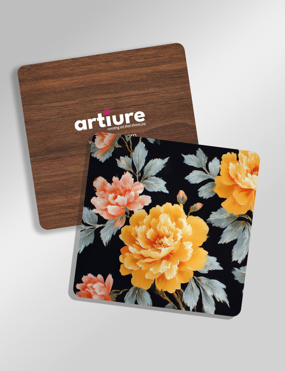 These coasters blend natural warmth with vibrant botanicals. One tile showcases a radiant yellow peony set against a deep black backdrop, while the companion features coral blossoms and silvery-green leaves, creating striking contrast and a refined atmosphere. The pattern feels both contemporary and timeless, suitable for modern kitchens, dining nooks, or gallery-inspired cafés. The surface is printed with durable inks for everyday use, paired with a soft, woodgrain-backed backing that adds a tactile, organic touch. Ideal for gifting or elevating a coffee corner, these coasters invite slow sips and thoughtful moments as colors shimmer under light.
