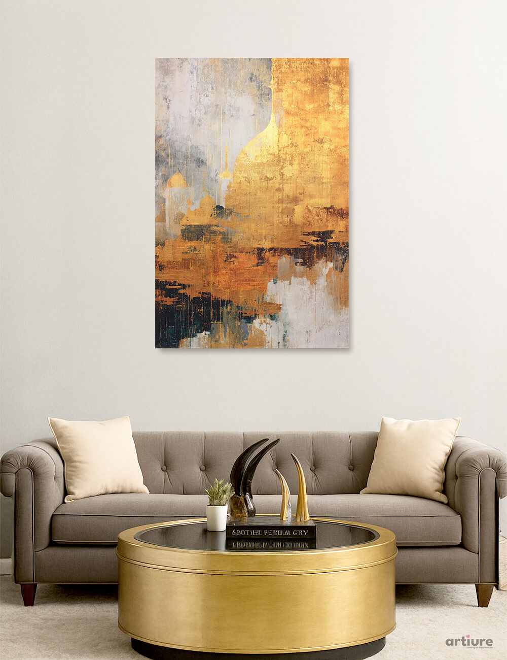 An evocative abstract canvas print that captures the glow of gold against moody neutrals. Broad, textured swaths of metallic gold rise over layers of soft gray, taupe and ivory, with amber accents suggesting a distant horizon. The composition blends architectural angularity with brushy, organic marks, creating a sense of rhythm and drama that shifts with light. This piece invites a contemplative focal point in contemporary living spaces, pairing luxe warmth with restraint. The tactile surface mimics weathered plaster and gilded surfaces, offering a tactile, gallery-like presence that remains versatile from sunlit afternoons to subdued evenings. A statement work that harmonizes opulence and calm, ideal for modern interiors seeking a refined yet approachable centerpiece.