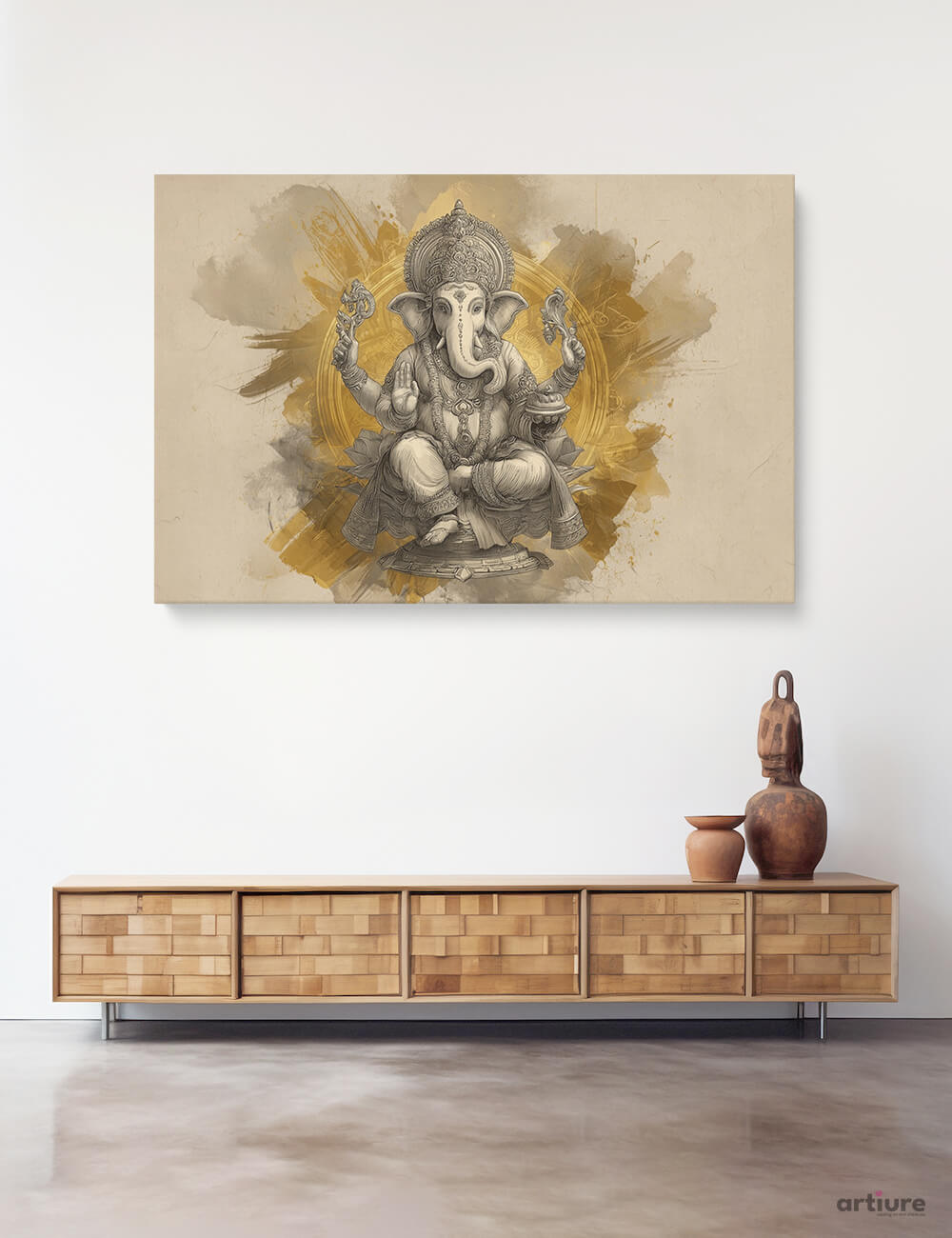 This canvas artwork blends fine sketch artistry with spiritual symbolism, presenting Lord Ganesha in a seated posture of calm authority. His multiple arms hold sacred objects — the goad, the noose, sweets, and the hand raised in blessing — each a reminder of divine guidance. The monochrome sketching contrasts with the vibrant golden backdrop, symbolizing enlightenment and prosperity radiating outward. Rendered in a contemporary yet devotional style, this piece bridges tradition and modern aesthetics, making it perfect for meditation spaces, living rooms, or as a housewarming blessing.