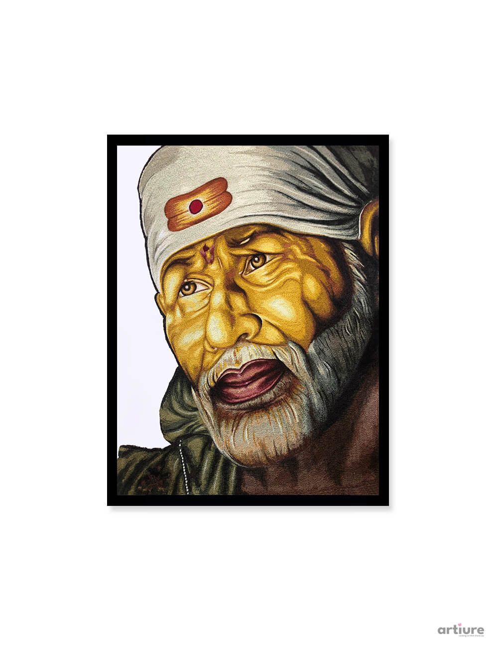 Golden Grace of Shirdi is a powerful textile artwork by Arun Bajaj that portrays the serene yet deeply expressive presence of Sai Baba. Rendered in luminous golden tones, the artwork emphasizes spiritual wisdom, humility, and compassion. Fine textile detailing enhances facial textures, soulful eyes, and the gentle flow of the beard, creating a lifelike yet devotional aura. The tilak and headscarf symbolize faith and surrender, while the warm palette evokes divine energy and inner peace. This piece bridges sacred tradition and contemporary textile artistry, making it ideal for meditation spaces, spiritual interiors, and collectors seeking meaningful, timeless Indian devotional art.
