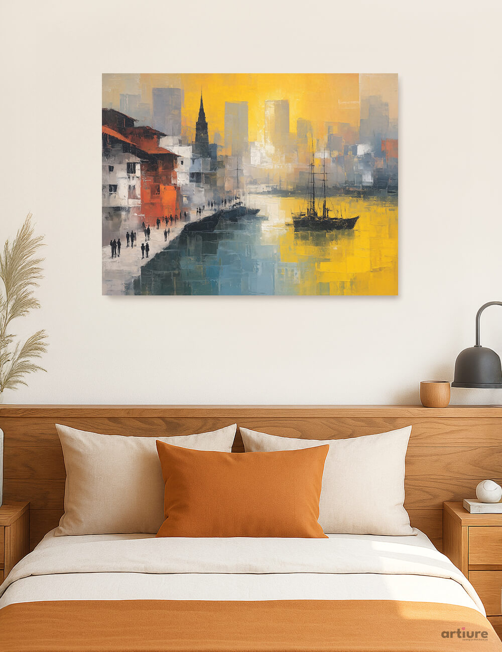 This canvas prints piece presents a luminous cityscape where towers dissolve into blocks of color and light. A sunlit palette of yellows and warm ochres clashes with cool blues and grays, suggesting the glow of sunset over a bustling harbor. Textural, impasto-like strokes create movement along shorelines and docks, while a solitary sailboat anchors the middle ground, guiding the eye toward a distant skyline. The composition balances abstraction and recognition, making it versatile for modern living rooms, bedrooms, or creative studios. Perfect for spaces that celebrate urban energy, contemporary décor, and bold color statements without overwhelming other artwork.