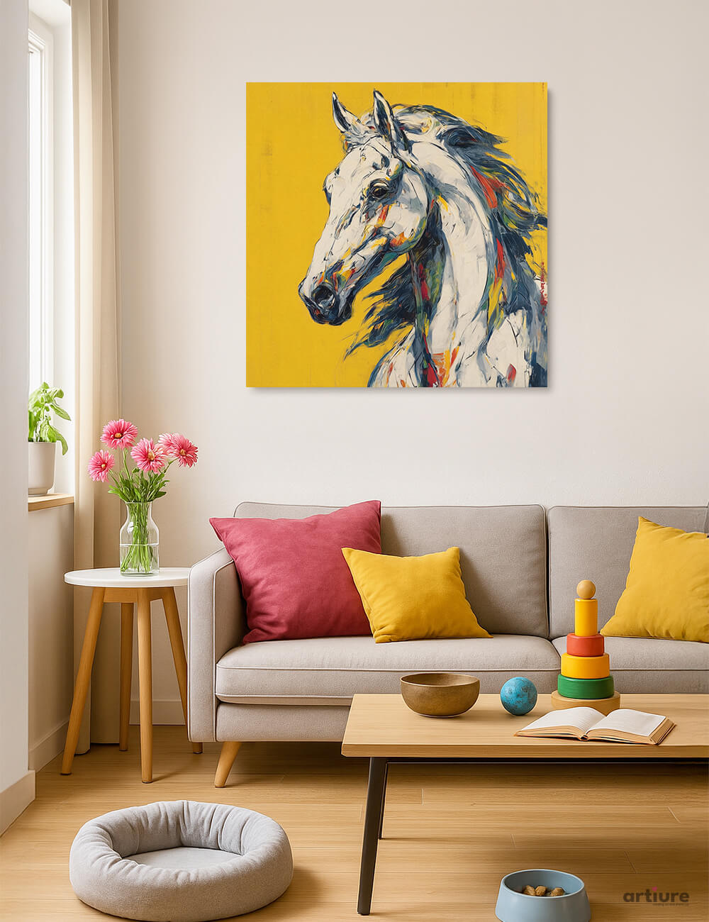 A dynamic canvas print that captures a horse in bold, expressive strokes against a sunny yellow field. The composition blends energetic blues, reds, and whites to evoke movement and vitality, making it a focal piece for modern living spaces. Printed on high-quality canvas, the artwork brings painterly texture and cinematic color to your wall, elevating minimalist interiors with a splash of spirited color. Ideal for living rooms or studios seeking contemporary flair and a memorable, statement-making accent.
