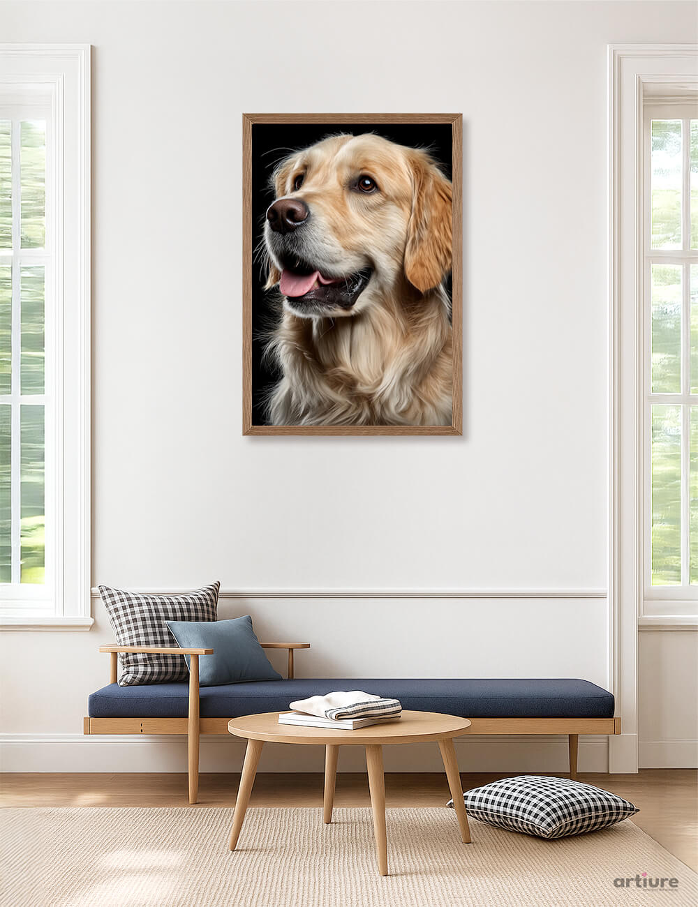A photorealistic portrait of a golden retriever rendered with meticulous detail, set against a deep black backdrop and housed in a warm wooden frame. The artwork hangs on a pale wall above a contemporary living area featuring a slender blue-cushioned bench, a round wooden coffee table, and a soft rug. The composition emphasizes the dog’s expressive eyes and friendly, open-mouthed expression, inviting a sense of companionship. The piece blends classic portrait sensibilities with modern interior cues, making it ideal for relaxing spaces like living rooms and entryways. Printed as an art print suitable for wall display, it adds warmth and character to interiors that favor clean lines and cozy tones.