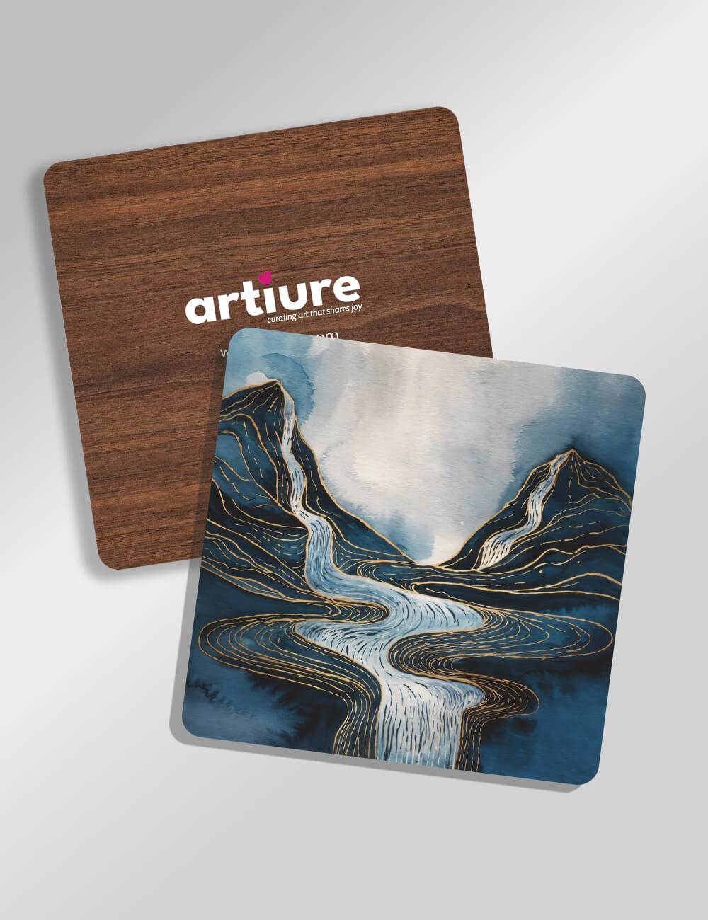 Rendered as a bold landscape of stylized mountains, a sinuous river flows between ink-dark peaks outlined in shimmering gold. This coaster pair pairs a rich blue palette with a warm wood-backed surface, offering a contemporary vignette that elevates daily dining. The print captures crisp lines and subtle gradients, while the rounded corners sit comfortably on tabletops. The warm backing adds tactile contrast, making these coasters both protective and decorative in kitchens, dining rooms, or coffee nooks. They suit modern, rustic, or boho interiors, blending artisanal charm with a touch of luxury. AI-generated art ensures fresh, imaginative visuals with every print.