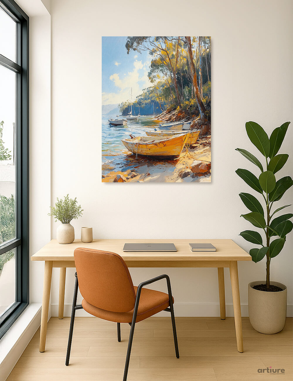 Bright, breezy and inviting, this canvas print captures a coastal harbor bathed in afternoon light. Thick impasto brushstrokes render yellow boats resting on quiet waters, while olive greens and warm browns define the shoreline and sunlit foliage. The scene combines classic impressionist movement with contemporary room presence, making it a statement piece that complements neutral workspaces or living areas. Hang above a desk or in a reading nook to evoke calm momentum and a touch of seaside charm. The palette offers sunshine and shade in balanced measure, inviting daily moments of inspiration and creative focus.