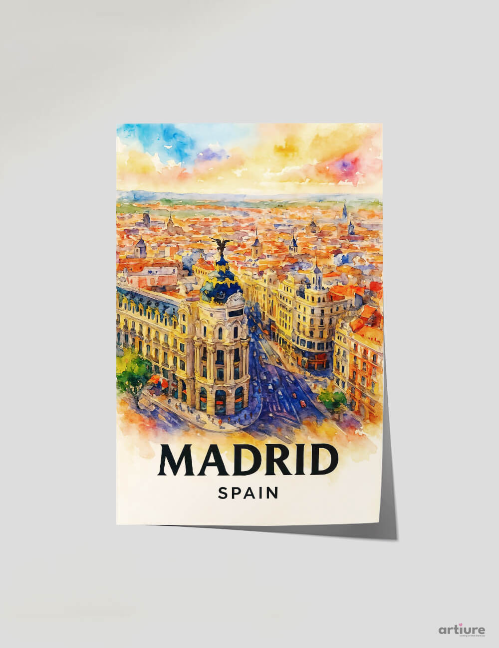This elegant poster highlights the grandeur of Madrid’s architecture with a golden sunset cascading over the famed Gran Vía. At the heart of the scene, the Metropolis Building stands proud, its ornate dome and angelic statue glowing in the warm light. A perfect tribute to Spanish urban majesty, this piece brings energy and sophistication to any space.