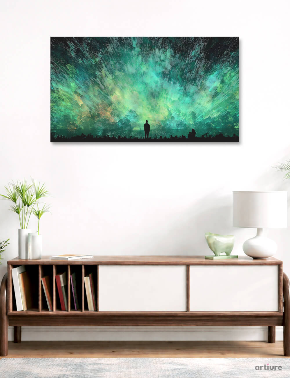 An expanded canvas print that captures a luminous green-teal aurora unfurling across a room, its energy radiating outward in painterly strokes. Silhouettes stand in quiet contemplation along a shadowed ground, their forms anchoring the vertigo of color. The piece blends abstract motion with a poetic stillness, inviting viewers to step into a dreamlike landscape where light and darkness converse. Crafted as a canvas print, it brings a dynamic gradient of greens and teals to contemporary interiors, balancing bold presence with a refined, minimalist mood. Ideal for modern living rooms or galleries seeking a statement of kinetic serenity.