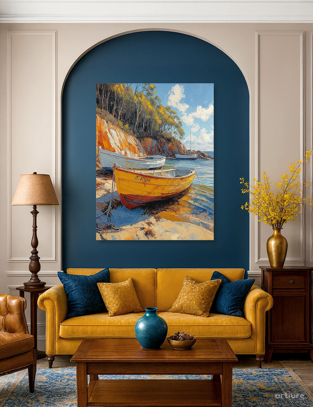 An evocative coastal scene rendered as a vibrant canvas print anchors the living space. Bold yellows and azure blues collide with warm ochres and sandy neutrals, while the arching blue wall frames the boats like a seaside window. The print blends impressionistic brushstrokes with contemporary composition, inviting the eye to wander from foreground nets to distant horizons. Paired with a mustard sofa, teal accents, and natural wood furniture, the piece exudes optimistic energy and coastal calm. This wall art acts as a focal point that sparks conversation while coordinating with both modern and traditional interiors.