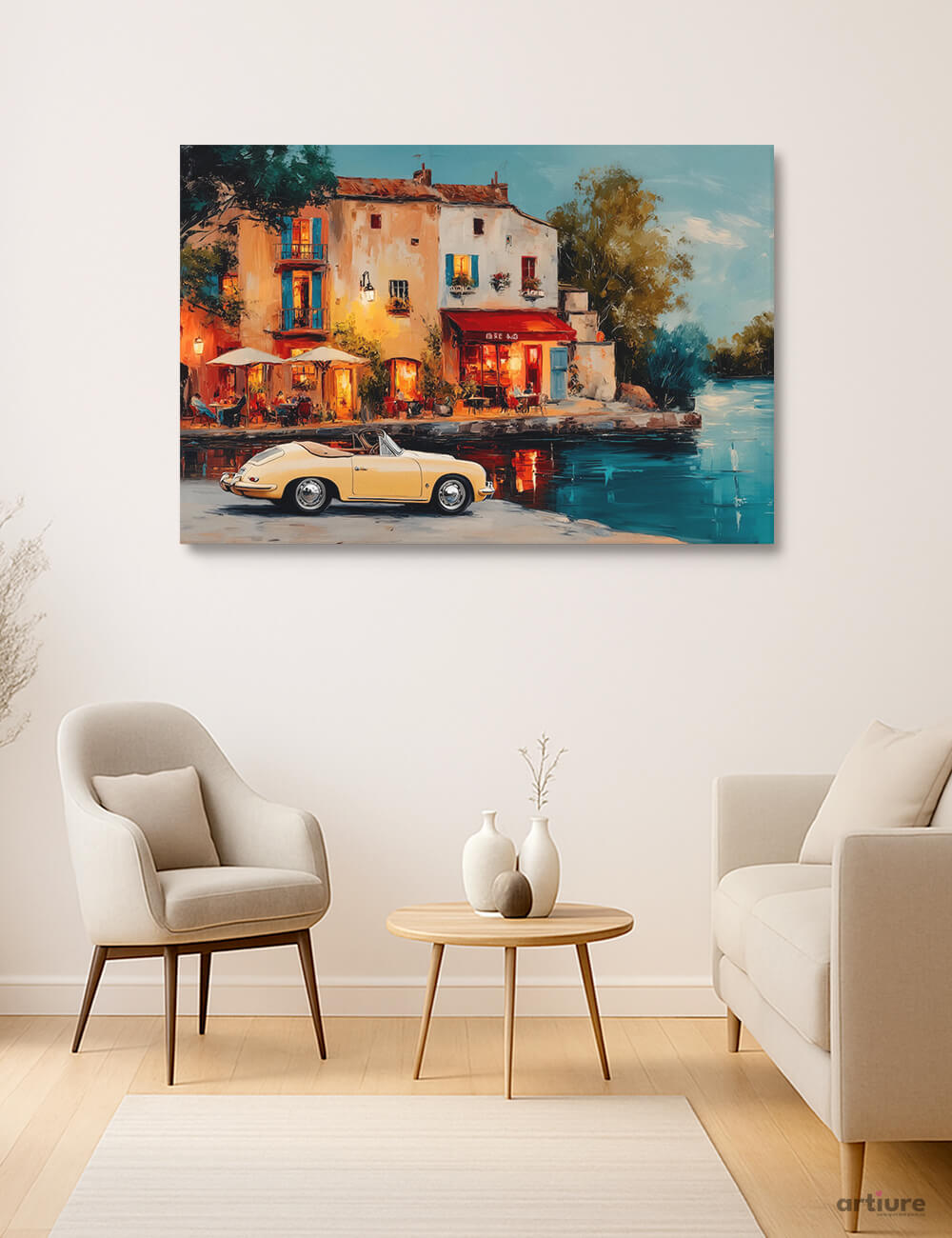 Vibrant brushwork captures a sunlit harbor town where pastel facades glow beside a tranquil waterway and a pale-yellow convertible rests along the quay. This canvas print exudes a maritime warmth, with warm oranges and ambers offset by cool blues and teals that mirror the sky and sea. Thick, expressive strokes evoke the glow of lanterns, café terraces, and blooming greenery spilling from balconies. Ideal for living rooms or creative workspaces, it infuses interiors with a nostalgic vacation mood while keeping a contemporary edge through its brisk, painterly texture. A statement piece that invites daydreams of coastal escapes and timeless charm.