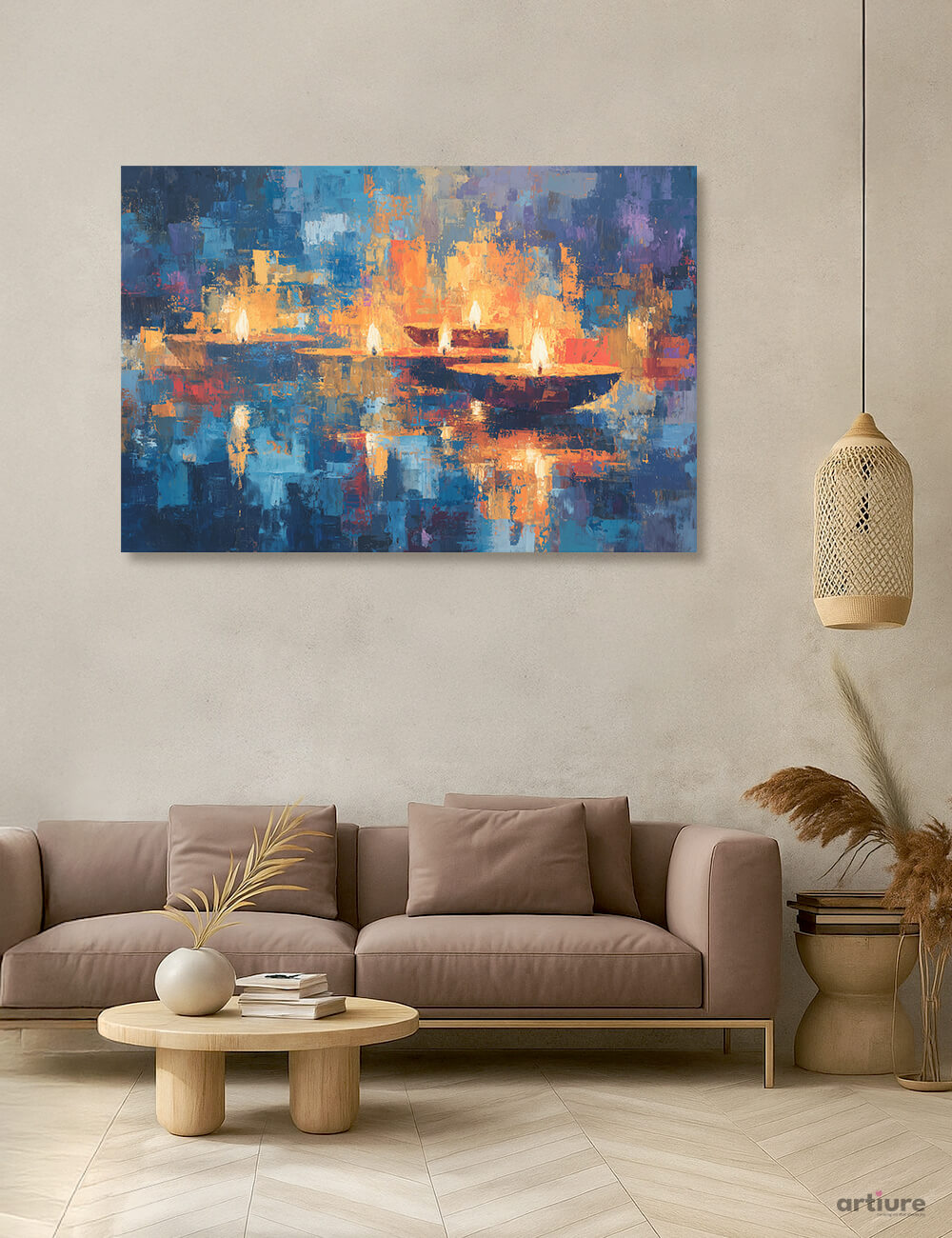 This AI-generated canvas print bursts with color and motion, translating an imagined harbor into a mosaic of painterly blocks. Deep blues and teals pool with bright oranges and yellows, while warm highlights suggest distant flames reflected on water. The composition fuses abstract geometry with a hinted seascape, guiding the eye across the surface as if the boats drift through a dreamscape. Rich textures mimic brushwork, giving the piece a tactile presence that feels at once contemporary and timeless. Sized to anchor a living room or gallery wall, it pairs beautifully with neutral furnishings and natural materials, inviting a calm energy punctuated by electric color. Ideal for modern interiors seeking a coastal, atmosphere-rich focal point.