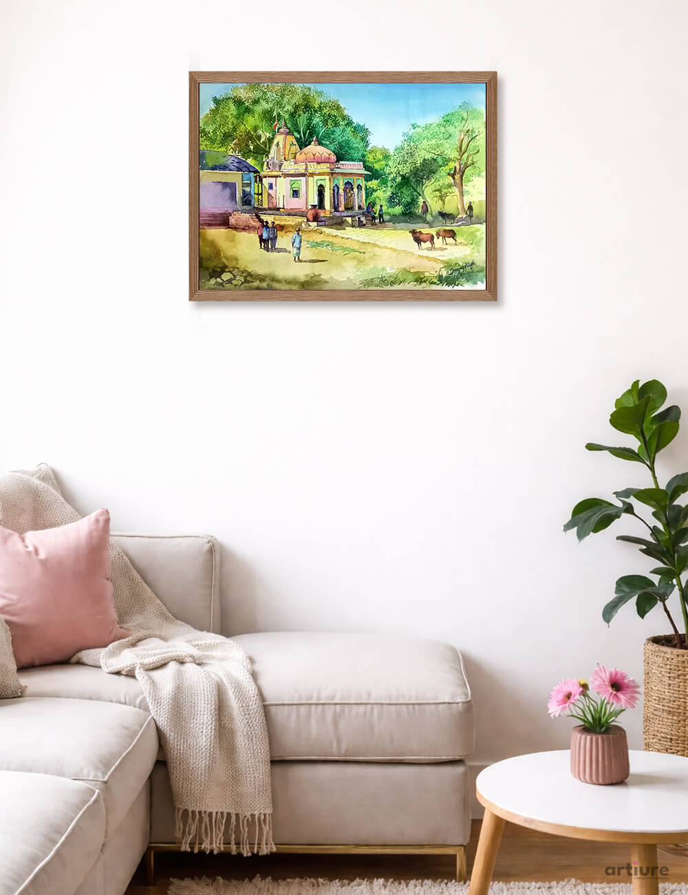 Harmony in Green beautifully captures a serene village setting where nature and spirituality coexist effortlessly. The watercolor composition highlights a temple nestled among vibrant trees, radiating calmness and cultural depth. Gentle human activity around the temple reflects everyday rural life, while grazing cattle enhance the pastoral charm. Soft washes of green and earthy tones create a soothing visual rhythm, emphasizing harmony between architecture and nature. The fluid watercolor technique adds a sense of lightness and movement, evoking a timeless atmosphere. This artwork celebrates simplicity, tradition, and the quiet beauty of life rooted in natural surroundings.