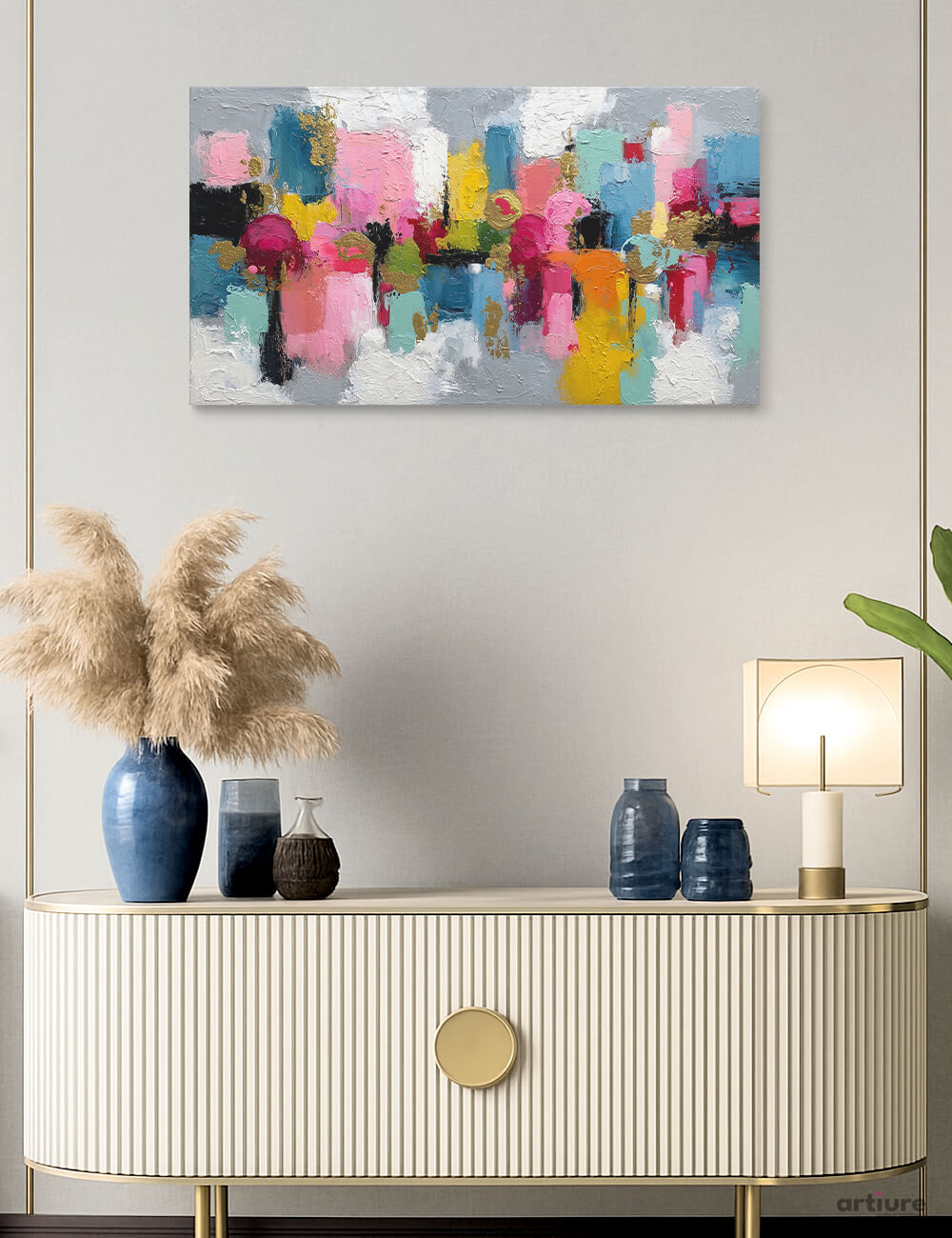 Some days demand more color than the world is willing to give. This piece delivers exactly that — an explosion of pink defiance against moody blues, with gold catching light like scattered coins. The paint moves with the kind of confidence that comes from letting go completely. Thick brushstrokes build layers of texture you want to reach out and touch, while the composition pulses with an energy that's part celebration, part rebellion. It's the visual equivalent of turning the music up loud and dancing in your kitchen. Hang it where life happens — a living room that needs waking up, a bedroom ready for bold dreams, or an office space that could use a daily reminder that beautiful chaos is still beautiful.