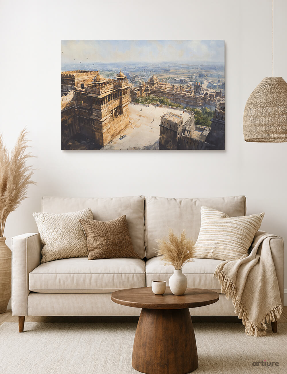 This canvas print captures an expansive fortress and cityscape bathed in golden daylight. Looming arches and domed towers rise above pale sands, while a distant horizon cools with blue skies. The painterly brushwork suggests impressionistic light, inviting a calm, contemplative mood to contemporary living rooms. The piece pairs soft beige walls and natural textures with its warm browns, muted whites, and a touch of cobalt blue, making it versatile for earthy interiors. Framed by a clean, minimalist environment, it acts as a quiet focal point that encourages curiosity about history and architecture without overpowering the space. A refined addition for homes that favor timeless scenes and thoughtful, cultured decor.