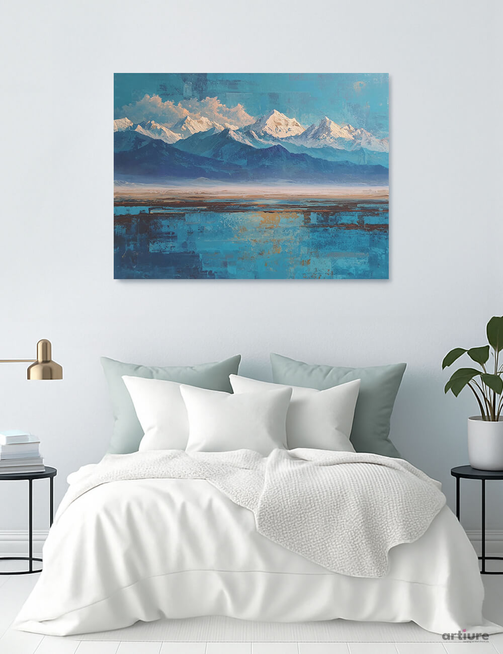 An expansive blue landscape unfolds across the canvas, where jagged snow‑topped peaks hover above a misty valley and a reflective turquoise plane anchors the foreground. Painted in layered blues and cool whites, the piece blends abstraction with a hint of realism, inviting the eye to travel from the quiet lake to the crisp alpine summits. Textural blocks and subtle gold accents suggest weathered light and distant horizons, while the overall mood remains serene and contemplative. Ideal for modern bedrooms or calm living spaces, this canvas print injects cool sophistication and a sense of vast, open air without overpowering the room. The composition balances negative space with a bold color story, making it a versatile focal point.