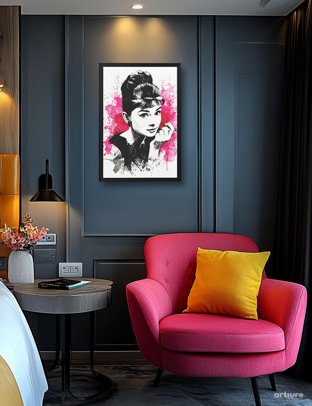 Audrey captures the unmistakable charm of Audrey Hepburn in a high-contrast, black-and-white ink sketch, punctuated by vivid pink splashes. This art print blends classic Hollywood allure with expressive street-art energy, creating a captivating tribute perfect for fashion-forward interiors or retro-modern décor.